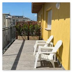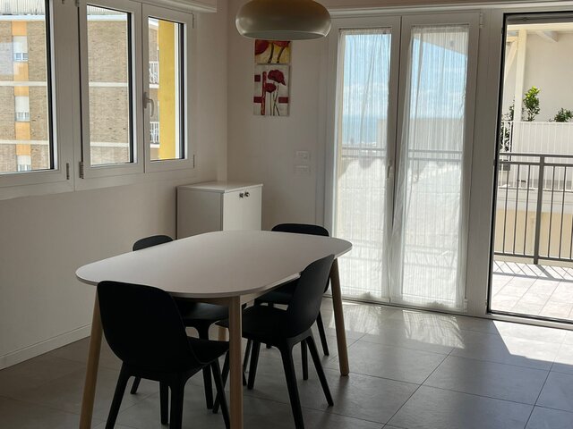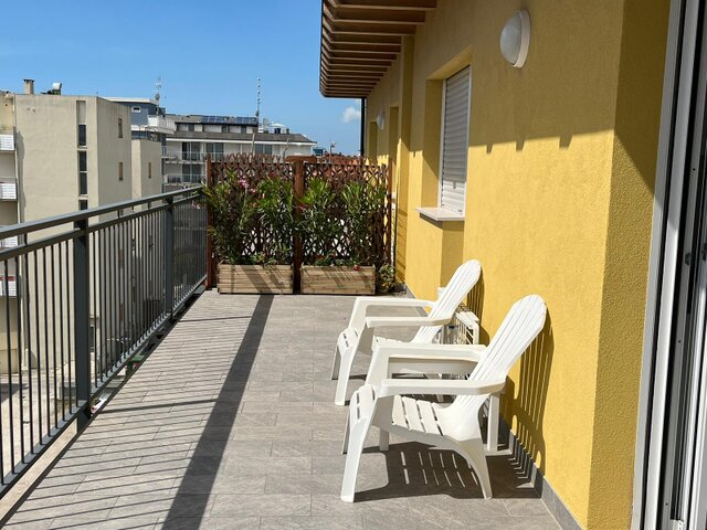 Questo appartamento è fornito di due grandi terrazzi, uno dei quali dotato di suggestiva vista sul mare, dove è possibile mangiare all'aperto o prendere il sole.