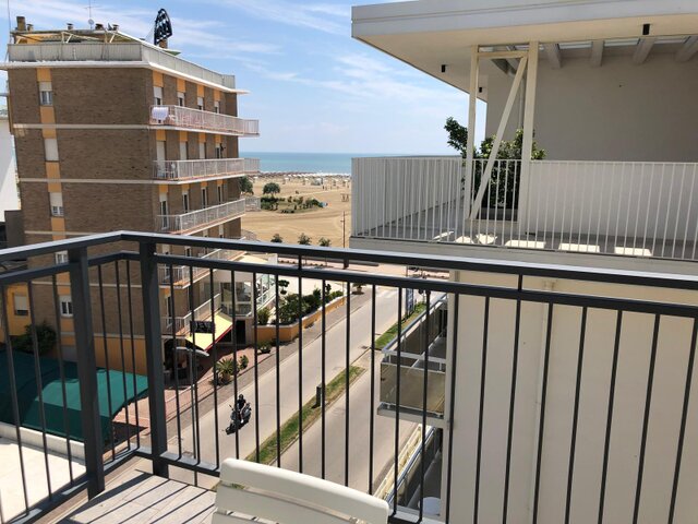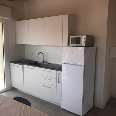 Bellissimo bilocale di nuova realizzazione al quarto ed ultimo piano del residence. Questo spazioso bivano è composto da un grande soggiorno con angolo cottura e divano letto doppio, camera matrimoniale e bagno con box doccia ( attrezzato anche per persone diversamente abili ).