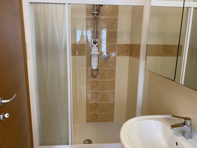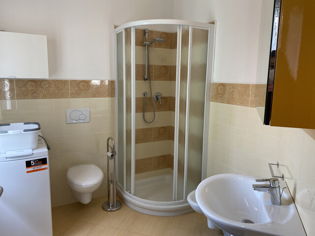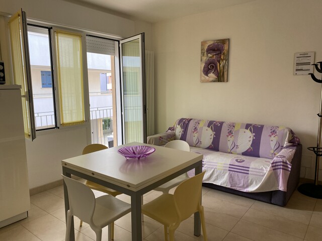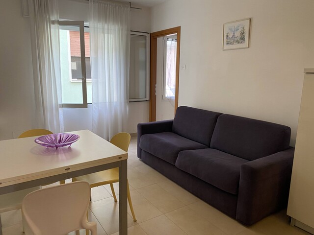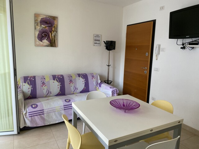 Appartamento al primo piano composto da una camera matrimoniale con terzo letto singolo apribile, soggiorno con angolo cottura e divano letto doppio, bagno con ampio box doccia e terrazzino con tavolino e sedie da esterno con accesso dal soggiorno.