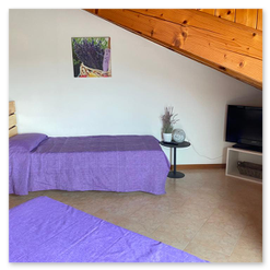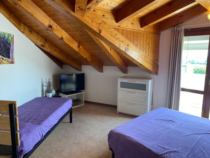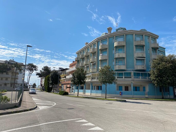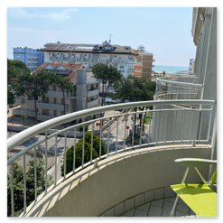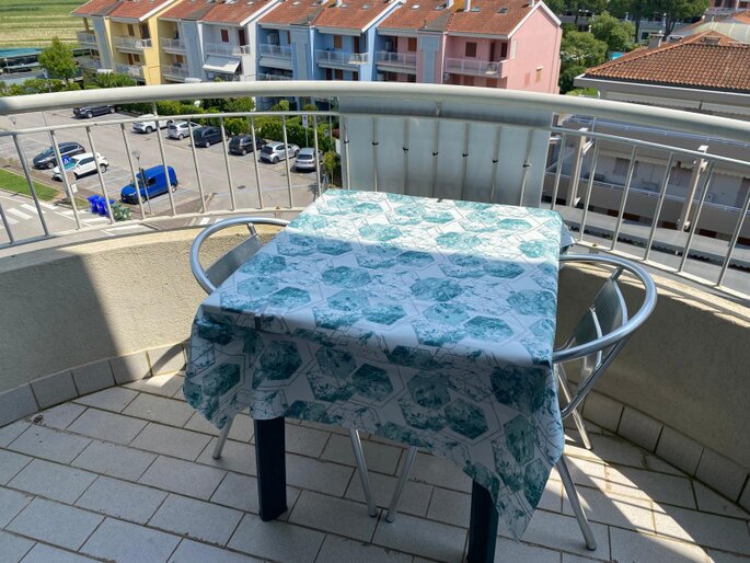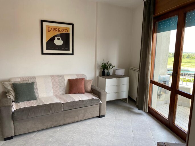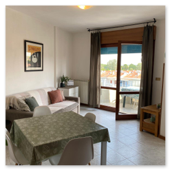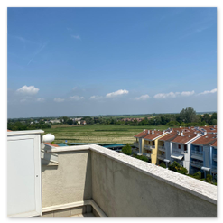 All'entrata dell'appartamento si trova un ampio soggiorno con cucina a vista, bagno finestrato con box doccia e angolo lavanderia. Dal soggiorno e dalla cucina si accede a due terrazzini che godono entrambi di vista mare e di una suggestiva visuale sulle montagne e sulla campagna circostante. Al piano superiore è si trova una grande camera matrimoniale con terzo letto e un secondo bagno finestrato con box doccia. Dalla camera da letto si accede ad un terrazzo solarium dotato di bellissima vista mare e sulle montagne. La dotazione è completa di aria condizionata ( con split su entrambi i piani ), connessione Wi-Fi, lavastoviglie, lavatrice e televisore a schermo piatto. La presenza dell'impianto di riscaldamento rende questa struttura adatta ad essere abitata durante tutto l'anno. Agli ospiti viene inoltre fornito un abbonamento per i parcheggi a pagamento del Comune di Caorle ( zone blu ) che permette di posteggiare la propria auto a pochi metri dal residence.